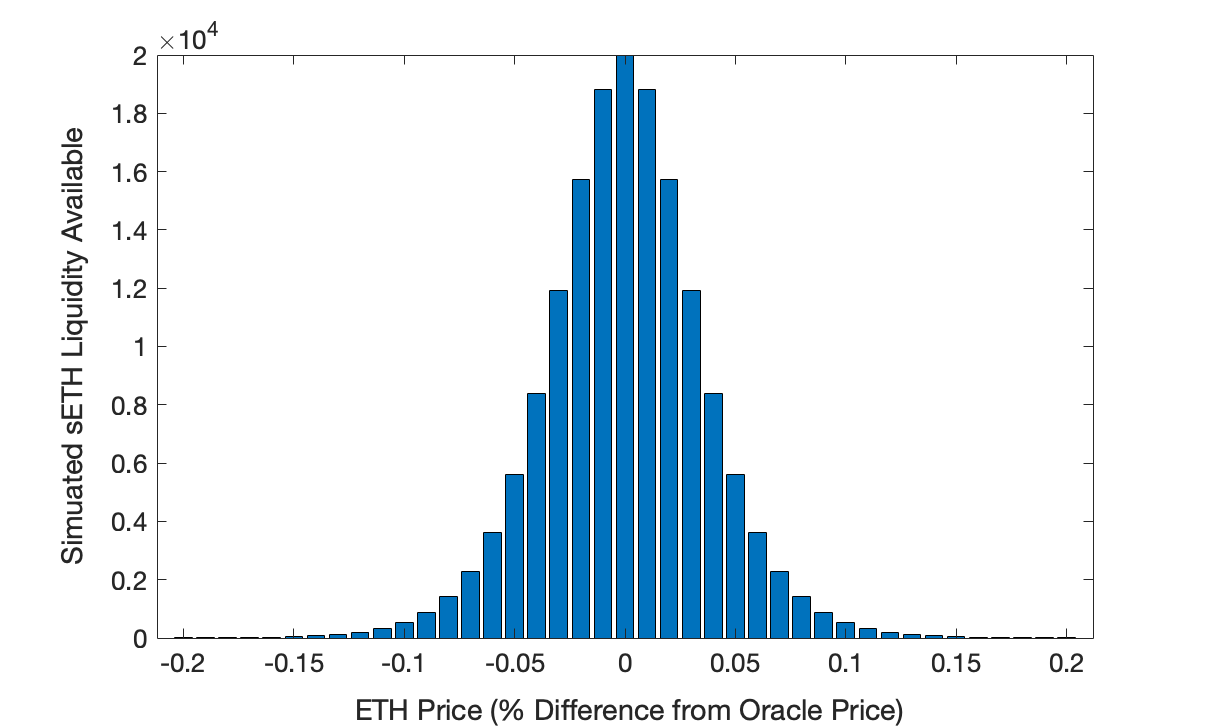 An important consideration for the viability of this framework is the variability of global liquidity over time and if it is amenable to periodic updates via SCCP. To illustrate, we examine BTC/USDT liquidity on Binance for all of 2020 (most liquid trading pair on the most liquid exchange, shown below). Here, we see that liquidity (when measured in base units rather than quote units) generally does not tend to evolve too rapidly over time. Note that the data shown below has undergone substantial smoothing. However, while order book depth is extremely erratic on short time frames, exploiting relatively small variabilities between liquidity offered on Synthetix and what is globally available in spot markets is an extremely risky and expensive exploit vector.